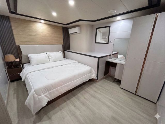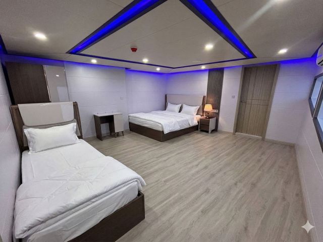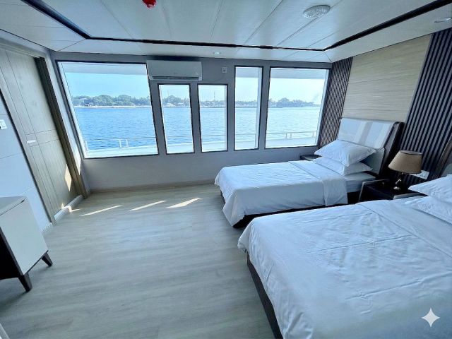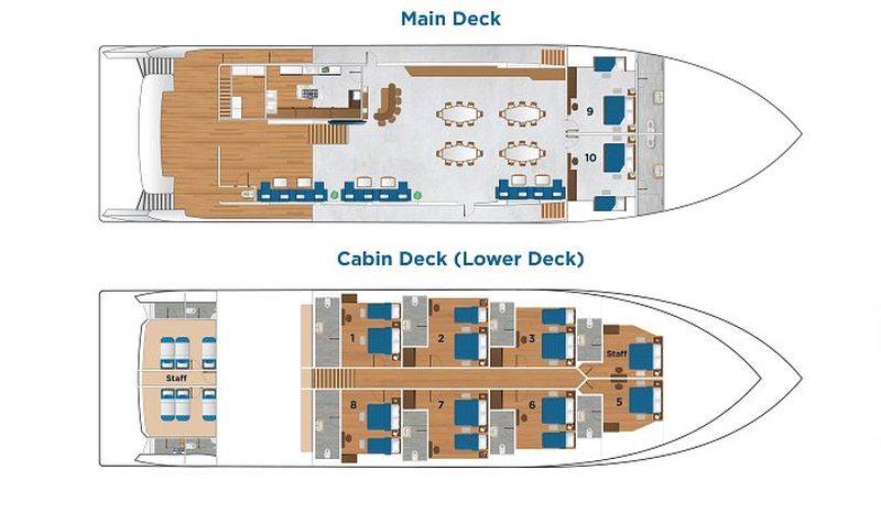 Auf dem Oberdeck befinden sich vier Suiten mit Queensize – Doppelbett und jeweils einem Einzelbett. Das Hauptdeck beherbergt zwei Suiten mit Kingsize – Doppelbett und jeweils einem Einzelbett. Im Unterdeck findet Ihr nochmal sechs Kabinen mit einem Doppelbett und jeweils einem Einzelbett und eine Kabine mit einem Doppelbett.