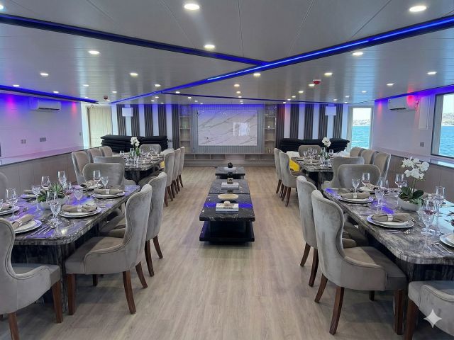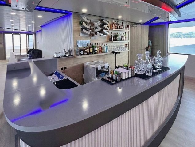 Auf dem Hauptdeck befindet sich eine klimatisierte Lounge inklusive Bar mit ausreichenden Sitzgelegenheiten. Hier befindet sich auch der geräumige Essbereich. Ebenfalls stehen eine kleine Bibliothek, eine Musikanlage mit TV/DVD-Kombinationen und Brettspiele zur Verfügung. Auch auf dem Ober- und Sonnendeck laden Loungemöbel und eine Bar zum Verweilen und Entspannen ein. Die Kabinen befinden sich auf dem Unter-, Haupt- und Oberdeck.